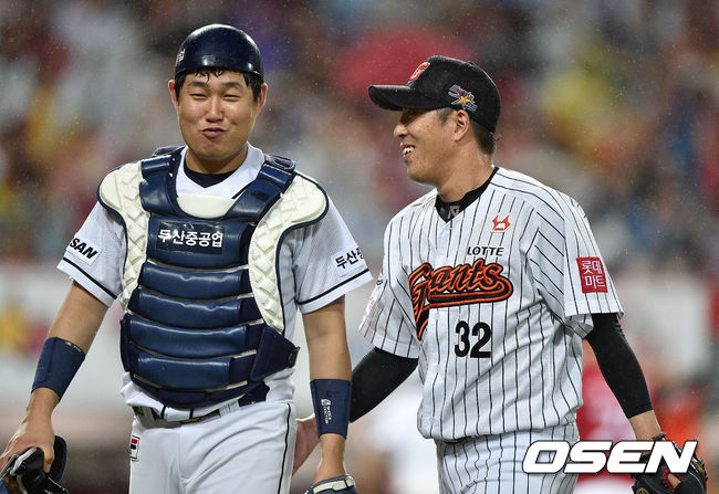 7회초 공수교대때 동군 포수 양의지와 김승회가 이야기를 나누며 더그아웃으로 가고 있다.