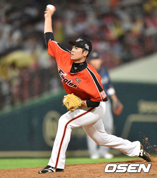 7회말 무사에서 동군 이태양이 힘차게 공을 던지고 있다.