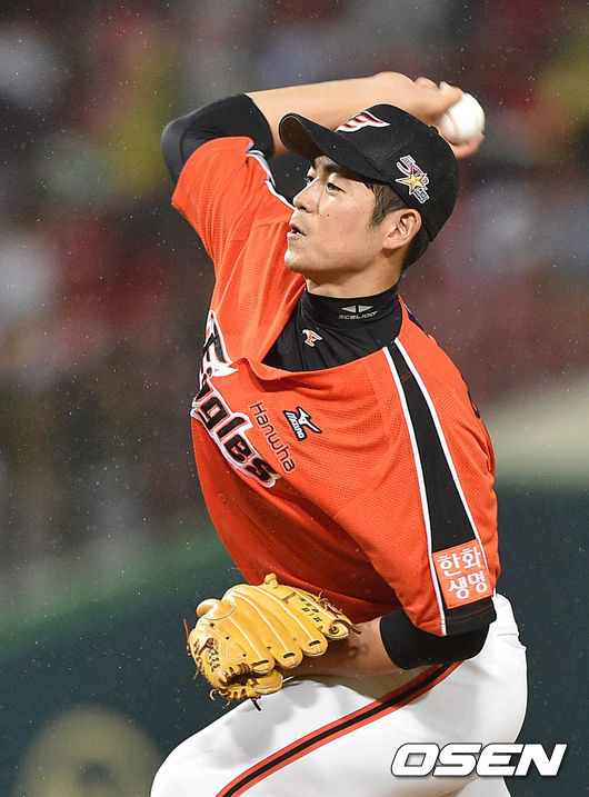 7회초 동군 이태양이 힘차게 공을 던지고 있다.