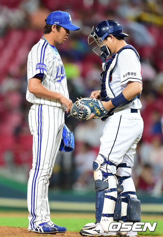18일 오후 광주 광주-기아 챔피언스 필드에서 열린 '2014 한국야쿠르트 세븐 프로야구 올스타전' 9회초 마운드에 올라온 임창용이 양의지와 이야기를 나누고 있다.