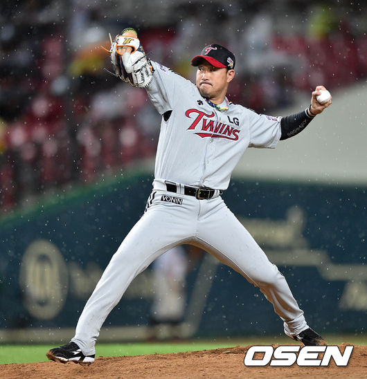 9회말 동군 봉중근이 힘차게 공을 던지고 있다.
