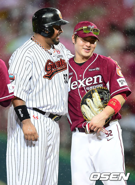 18일 오후 광주 광주-기아 챔피언스 필드에서 열린 '2014 한국야쿠르트 세븐 프로야구 올스타전' 경기 종료 후 박병호와 히메네스가 인사를 나누고 있다.