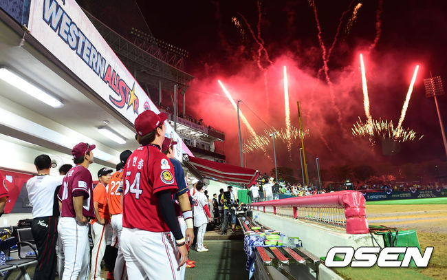 18일 오후 광주 광주-기아 챔피언스 필드에서 열린 '2014 한국야쿠르트 세븐 프로야구 올스타전' 경기 종료 후 웨스턴팀 선수들이 불꽃놀이를 지켜보고 있다.