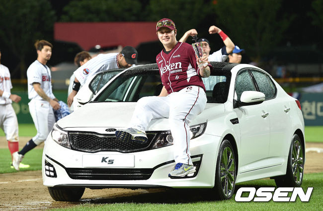 18일 오후 광주 광주-기아 챔피언스 필드에서 열린 '2014 한국야쿠르트 세븐 프로야구 올스타전' 경기 종료 후 MVP를 수상한 서군 박병호가 부상으로 받은 차 위에서 취재진을 향해 포즈를 취하고 있다.