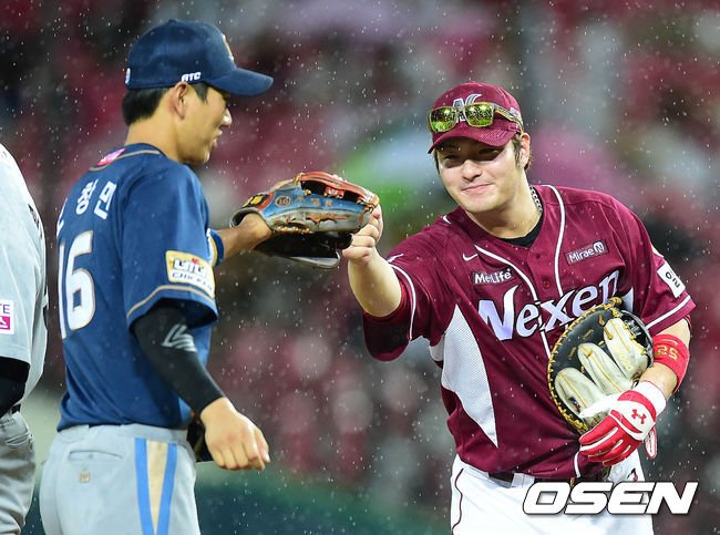 18일 오후 광주 광주-기아 챔피언스 필드에서 열린 '2014 한국야쿠르트 세븐 프로야구 올스타전' 경기 종료 후 모창민과 박병호가 하이파이브를 하고 있다.