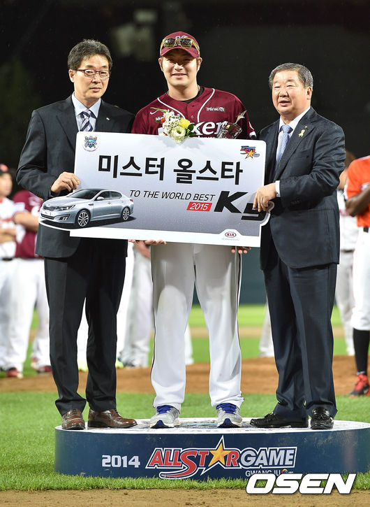 18일 오후 광주 광주-기아 챔피언스 필드에서 열린 '2014 한국야쿠르트 세븐 프로야구 올스타전' 경기 종료 후 MVP를 수상한 서군 박병호가 포토타임을 갖고 있다.