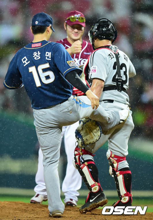 18일 오후 광주 광주-기아 챔피언스 필드에서 열린 '2014 한국야쿠르트 세븐 프로야구 올스타전' 경기 종료 후 모창민이 최경철의 엉덩이를 걷어 차고 있다.