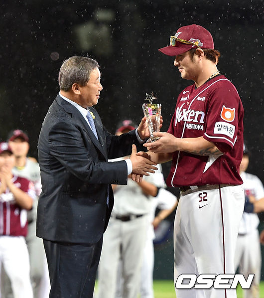 18일 오후 광주 광주-기아 챔피언스 필드에서 열린 '2014 한국야쿠르트 세븐 프로야구 올스타전' 경기 종료 후 서군 박병호가 구본능 KBO 총재로부터 미스터 올스타를 수상하고 있다.
