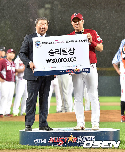 18일 오후 광주 광주-기아 챔피언스 필드에서 열린 '2014 한국야쿠르트 세븐 프로야구 올스타전' 경기 종료 후 서군 안치홍이 승리팀상을 수상하고 있다.
