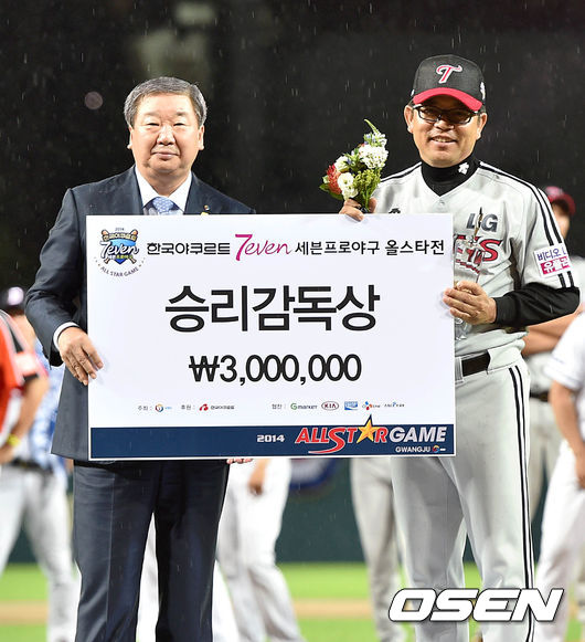 18일 오후 광주 광주-기아 챔피언스 필드에서 열린 '2014 한국야쿠르트 세븐 프로야구 올스타전' 경기 종료 후 서군 양상문 감독이 승리감독상을 수상하고 있다.