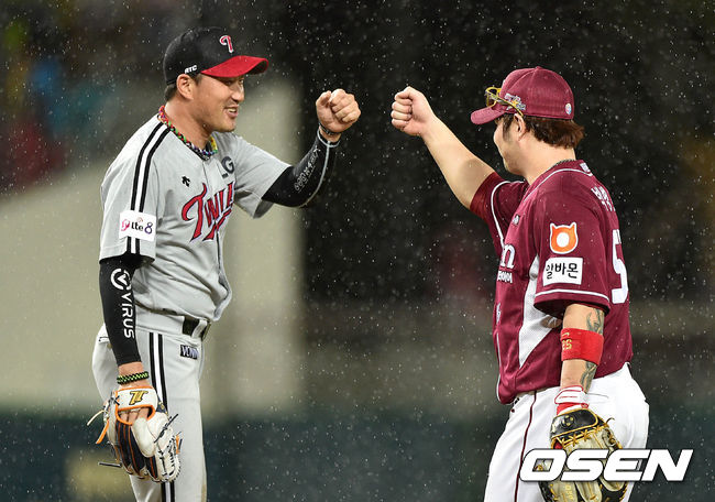 18일 오후 광주 광주-기아 챔피언스 필드에서 열린 '2014 한국야쿠르트 세븐 프로야구 올스타전' 경기 종료 후 서군 봉중근과 박병호가 하이파이브를 하고 있다.