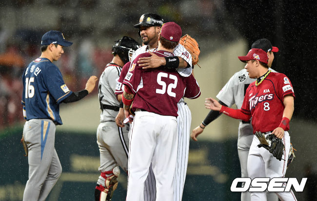 18일 오후 광주 광주-기아 챔피언스 필드에서 열린 '2014 한국야쿠르트 세븐 프로야구 올스타전' 경기 종료 후 양팀 선수들이 인사를 나누고 있다.