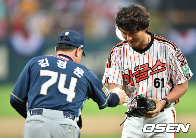 18일 오후 광주 광주-기아 챔피언스 필드에서 열린 '2014 한국야쿠르트 세븐 프로야구 올스타전' 경기 종료 후 시구를 마친 박찬호가 김경문 감독에게 공을 건네받고 있다.