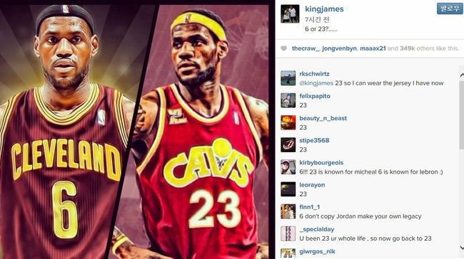 제임스는 18일(이하 한국시간) 자신의 SNS에 ‘6번과 23번 중 어느 번호를 달았으면 좋겠냐?’는 메시지와 함께 6번, 23번이 새겨진 클리블랜드 유니폼 사진을 공개했다.