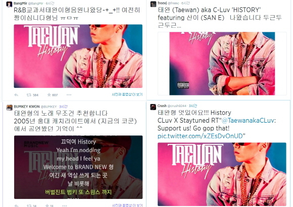이어 그의 컴백을 기다려 온 팬들은 “드디어 컴백!”, “’히스토리’에서 산이와 태완 호흡 정말 좋아요”, “태완 씨 목소리 정말 좋아요 일본으로도 오세요” 등 다양한 반응을 보이고 있다.
