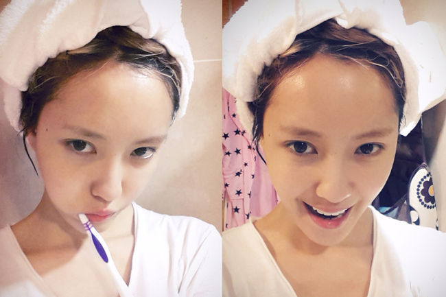 사진 속 효민은 아침에 일어나자마자 샤워를 한 뒤 화장기가 전혀 없는 민낯의 모습으로 수건을 머리에 두르고 양치질을 하며 귀여운 표정을 짓고 있다. 효민은 민낯으로도 굴욕 없는 물광 피부와 미모를 과시했다.