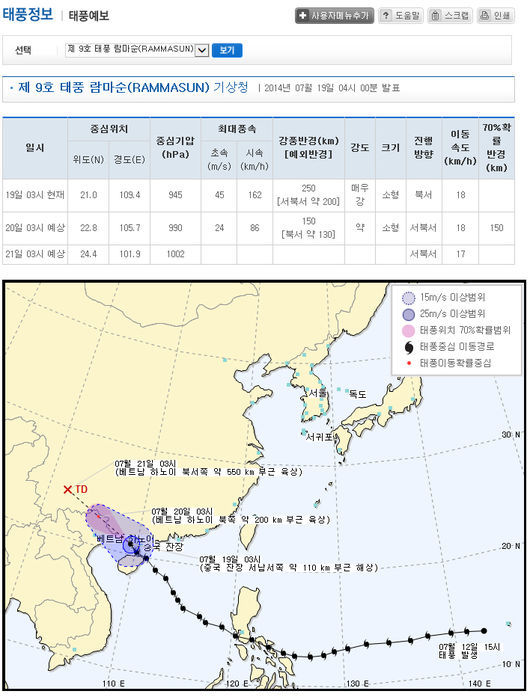 태풍 람마순은 오는 20일 오전 3시 베트남 하노이 북쪽 약 200km 부근 육상으로 이동하면서 위력이 약해질 것으로 예상되고 있다. 기상청은 "24시간 이내에 열대저압부로 약화될 것으로 예상된다"고 전했다.