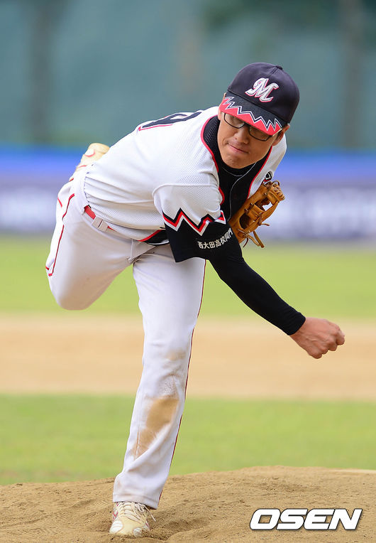 1회말 서대전고동문야구단 선발 투수 성충모가 힘차게 공을 던지고 있다.