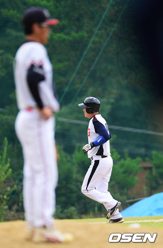 1회말 2사 주자 만루 얀양GMB 손진안이 만루 홈런을 치고 3루를 지나고 있다.