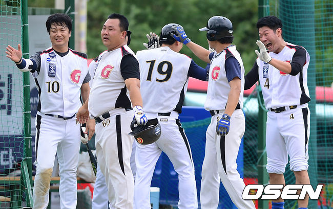 1회말 2사 주자 만루 얀양GMB 손진안이 만루 홈런을 치고 동료들과 기쁨을 나누고 있다.