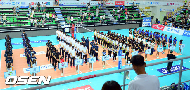 19일 오후 경기도 안산시 상록수체육관에서 진행된 우리카드컵 프로배구대회 개막식에서 선수들이 세월호 참사를 추모하는 묵념을 하고 있다.
