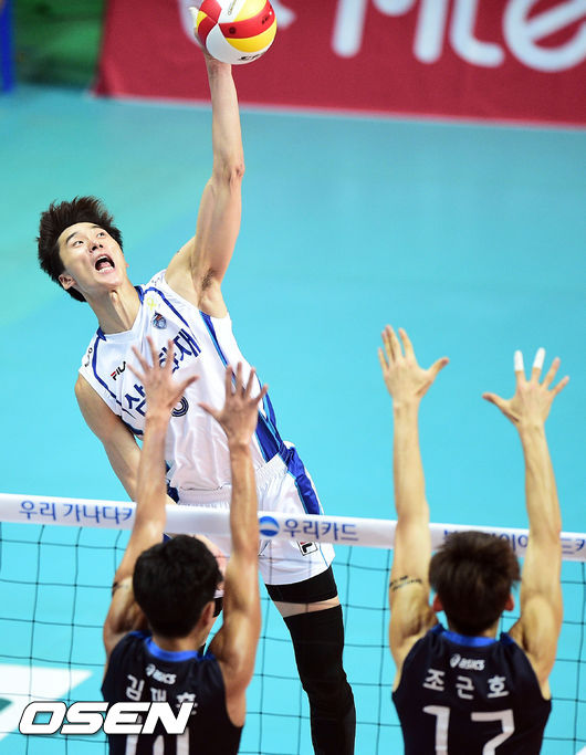 19일 오후 경기도 안산시 상록수체육관에서 진행된 '2014 우리카드컵 프로배구대회'(이하 코보컵) 삼성화재와 현대캐피탈의 경기, 1세트 삼성화재 박철우가 강타를 날리고 있다.
