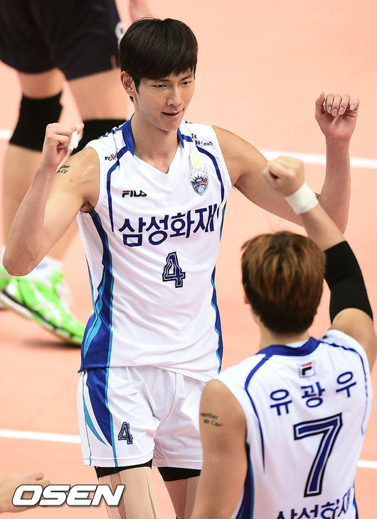 19일 오후 경기도 안산시 상록수체육관에서 진행된 '2014 우리카드컵 프로배구대회'(이하 코보컵) 삼성화재와 현대캐피탈의 경기, 2세트 삼성화재 류윤식이 공격 성공후 환호하고 있다.