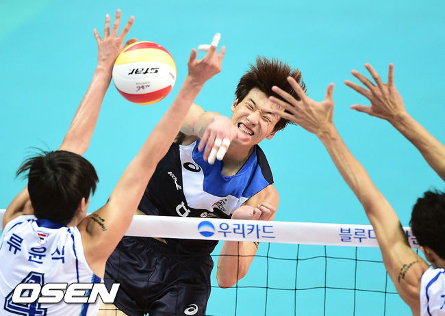 19일 오후 경기도 안산시 상록수체육관에서 진행된 '2014 우리카드컵 프로배구대회'(이하 코보컵) 삼성화재와 현대캐피탈의 경기, 2세트 현대캐피탈 송준호가 강타를 날리고 있다.