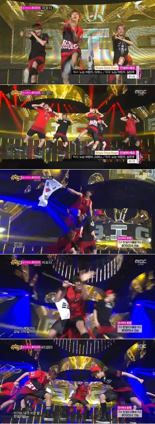 보이그룹 비아이지(B.I.G)가 태극기 퍼포먼스와 '방가춤'으로 눈길을 사로잡았다.