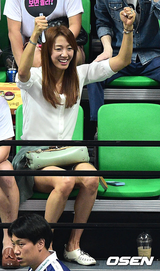 19일 오후 경기도 안산시 상록수체육관에서 진행된 '2014 우리카드컵 프로배구대회'(이하 코보컵) 여자부 A조 기업은행과 GS칼텍스의 경기, 대표팀 차출로 경기에 나서지 못하는 한송이가 GS칼텍스의 승리에 환호하고 있다.