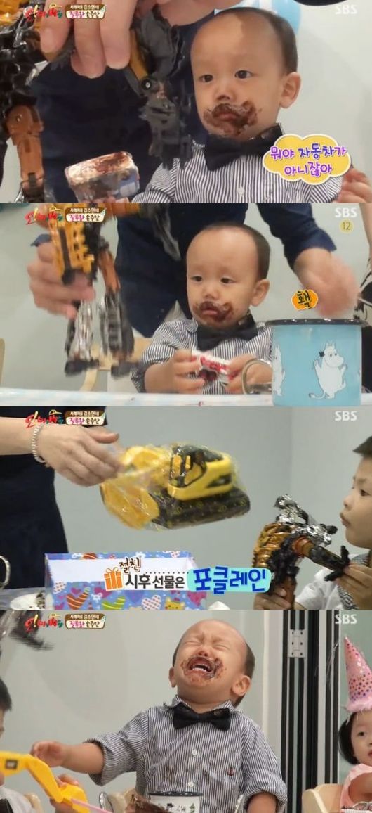 주안은 19일 오후 방송된 SBS 예능프로그램 '오 마이 베이비'에서 생일을 맞아 로봇 선물을 받았다. 그러나 그의 관심을 끈 것은 그의 친구가 선물받은 포클레인 장난감이었다.