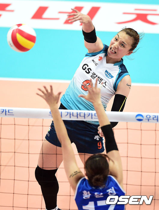 19일 오후 경기도 안산시 상록수체육관에서 진행된 '2014 우리카드컵 프로배구대회'(이하 코보컵) 여자부 A조 IBK 기업은행과 GS칼텍스의 경기, 2세트 GS칼텍스 표승주가 강타를 날리고 있다.