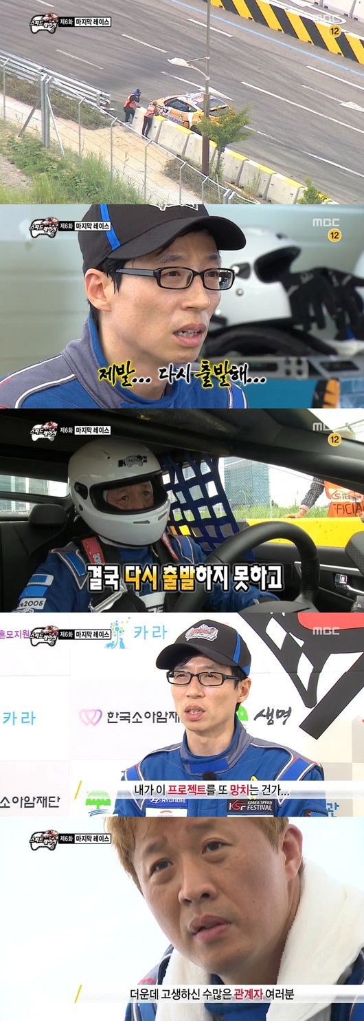 정준하는 끝까지 시동을 걸어보려 했으나 결국 안전요원들의 지시에 따라 차량을 탈출해야 했다. 마스터즈급 경기가 끝난 후 유재석은 “사고가 나면서도 정말 달리고 싶었는데”라며 완주를 못 한한 것 대한 아쉬움을 드러냈다.