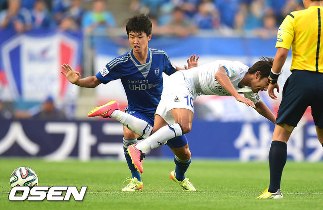 19일 오후 수원 월드컵경기장에서 열린 '현대오일뱅크 K리그 클래식 2014' 수원 삼성과 인천 유나이티드의 경기 전반 신세계와 이천수가 몸싸움을 벌이고 있다.