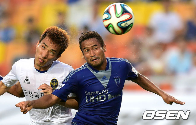 19일 오후 수원 월드컵경기장에서 열린 '현대오일뱅크 K리그 클래식 2014' 수원 삼성과 인천 유나이티드의 경기 전반 산토스가 헤딩슛을 넣고 있다.