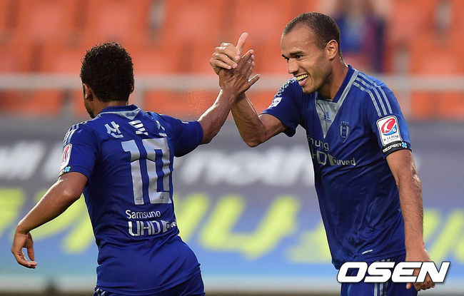 19일 오후 수원 월드컵경기장에서 열린 '현대오일뱅크 K리그 클래식 2014' 수원 삼성과 인천 유나이티드의 경기 전반 산토스가 골을 넣고 로저와 하이파이브를 하고 있다.