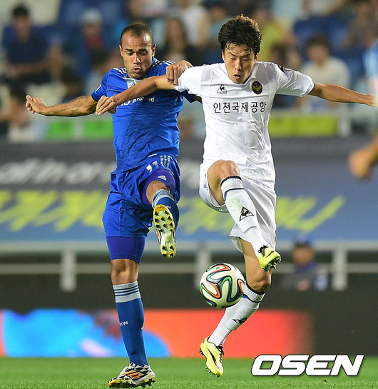 19일 오후 수원 월드컵경기장에서 열린 '현대오일뱅크 K리그 클래식 2014' 수원 삼성과 인천 유나이티드의 경기 후반 로저와 안재준이 볼다툼을 하고 있다.