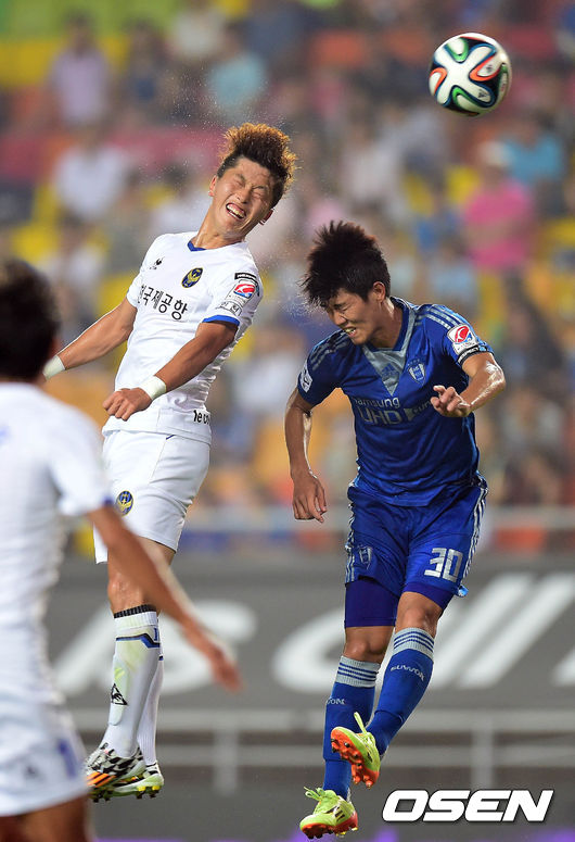 19일 오후 수원 월드컵경기장에서 열린 '현대오일뱅크 K리그 클래식 2014' 수원 삼성과 인천 유나이티드의 경기 후반 문상윤이 헤딩슛을 시도하고 있다.