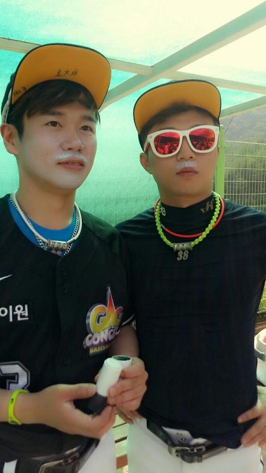 사진 속 박성광과 김대성은 야구복을 입은 채 한 곳을 응시하고 있다. 특히 두 사람은 선크림으로 콧수염을 만들어 웃음을 자아냈다.
