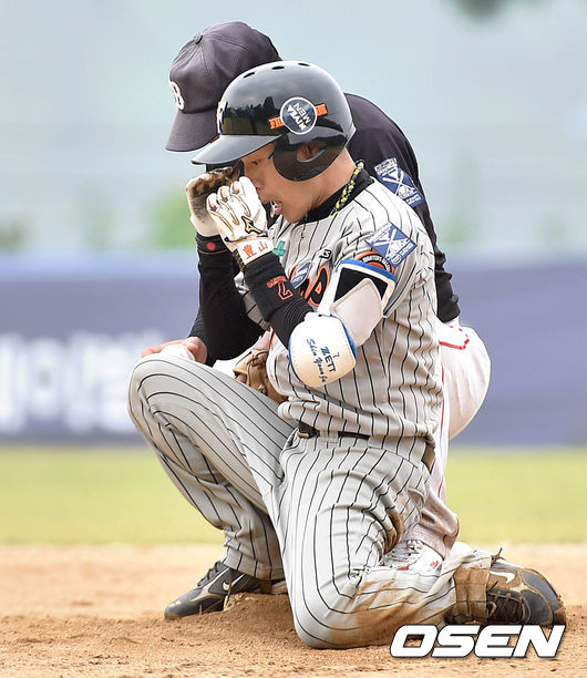 2회말 풍산화이터스 신윤재가 안타를 치고 안경을 고쳐 쓰고 있다.