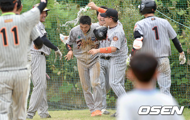 6회말 1사에서 풍산화이터스 2루주자 서주민이 도루를 시도해 3루 송구가 빠진 틈을 타 홈을 밟고 동료들과 환호하고 있다.