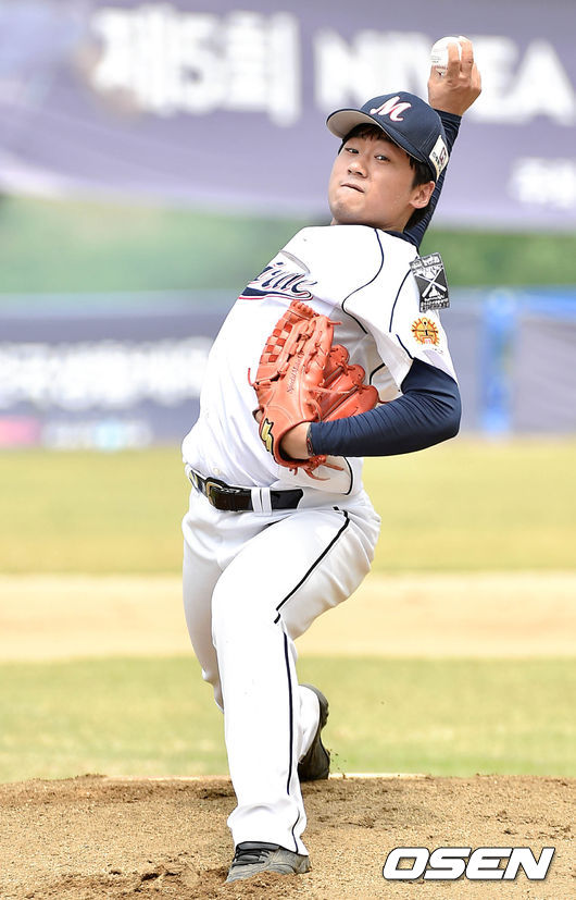 1회초 무사에서 미래의료재단 선발투수 나형균이 힘차게 공을 던지고 있다.