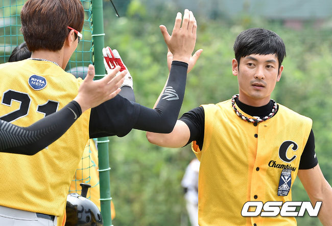 1회초 무사 2,3루에서 미래의료재단 나형균의 폭투때 홈을 밟은 챔피언스 3루주자 차재광이 더그아웃에서 동료들과 환호하고 있다.
