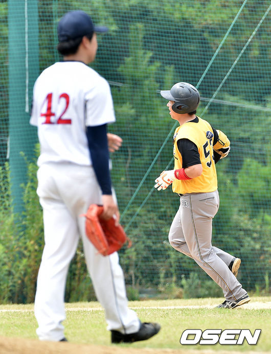 1회초 1사 2루에서 챔피언스 임정훈이 투런 홈런을 치고 그라운드를 달리고 있다.