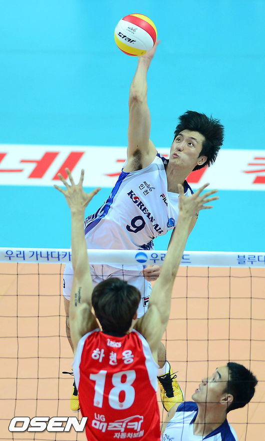 20일 오후 경기도 안산시 상록수체육관에서 진행된 '2014 우리카드컵 프로배구대회'(이하 코보컵) 남자부 B조 대한항공과 LIG손해보험 경기, 2세트 대한항공 곽승석이 스파이크를 시도하고 있다.