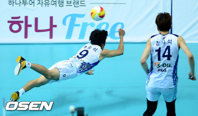 [OSEN=안산, 김경섭 기자] 20일 오후 경기도 안산시 상록수체육관에서 진행된 '2014 우리카드컵 프로배구대회'(이하 코보컵) 남자부 B조 대한항공과 LIG손해보험 경기, 2세트 대한항공 곽승석이 몸을 날리며 수비를 시도하고 있다.