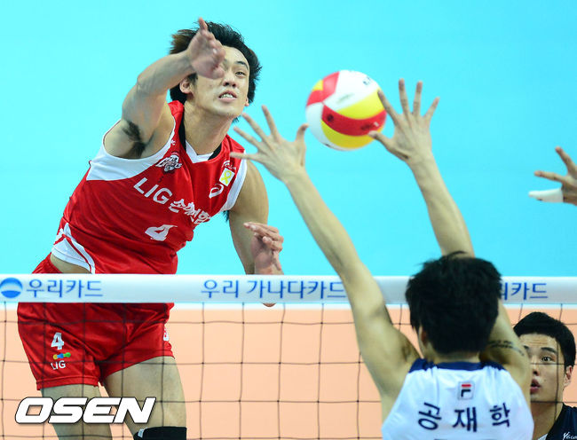 20일 오후 경기도 안산시 상록수체육관에서 진행된 '2014 우리카드컵 프로배구대회'(이하 코보컵) 남자부 B조 대한항공과 LIG손해보험 경기, 2세트 LIG 이강원이 강타를 날리고 있다.