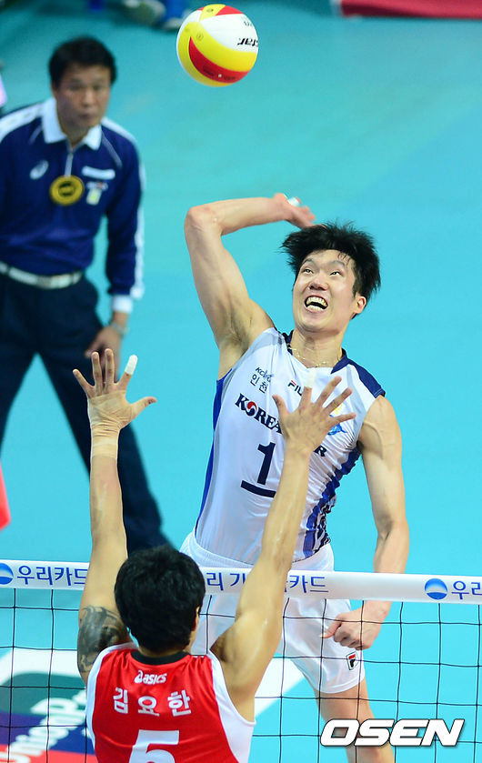 20일 오후 경기도 안산시 상록수체육관에서 진행된 '2014 우리카드컵 프로배구대회'(이하 코보컵) 남자부 B조 대한항공과 LIG손해보험 경기, 2세트 대한항공 신영수가 스파이크를 시도하고 있다.