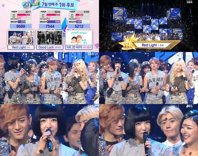 f(x)는 20일 오후 방송된 SBS '인기가요'에서 신곡 '레드 라이트'로 비스트의 '굿 럭', 허각X정은지의 '이제 그만 싸우자'를 제치고 1위를 거머쥐었다.