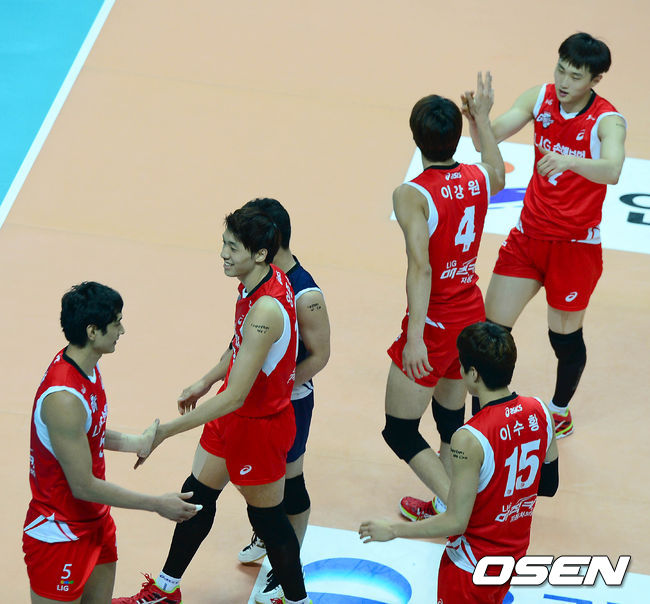 LIG손해보험은 20일 안산상록수체육관에서 열린 2014 안산·우리카드컵 프로배구대회(KOVO컵) 남자부 B조 조별리그 1차전서 대한항공을 세트스코어 3-1(25-23, 22-25, 25-17, 25-18)로 꺾고 기분 좋은 컵대회 첫 승을 일궜다.
